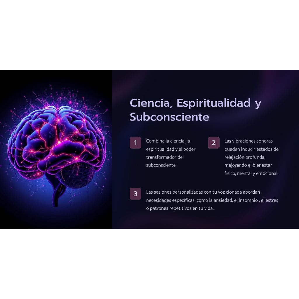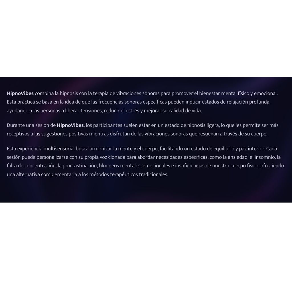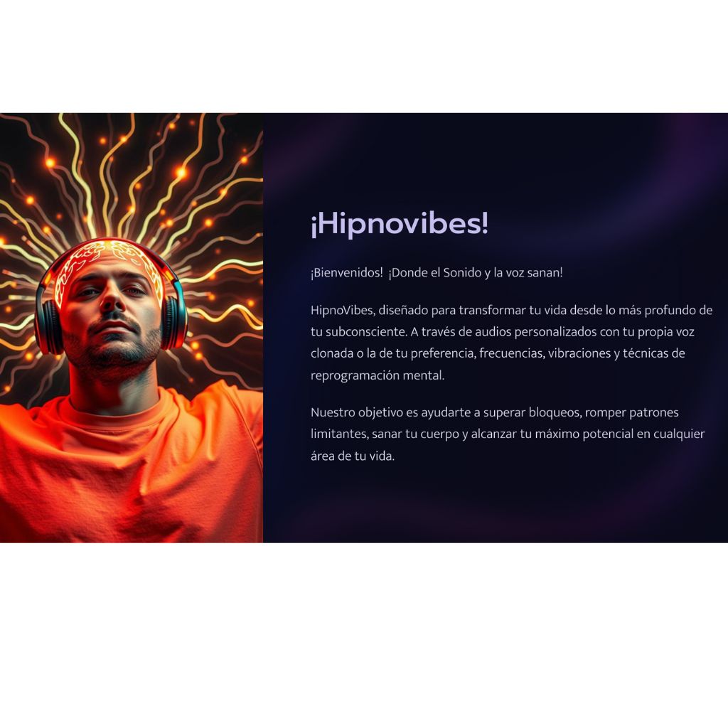 HipnoVibes fusiona hipnosis y vibraciones. Para crear audios únicos con tu voz e información personal. Reprograma tu subconsciente y libera todo tu potencial.